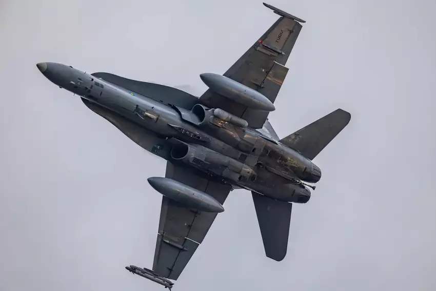 Einem Fotografen gelang es, ein Foto der AN/ALE-47-Wärmefalle auf einem F/A-18D Hornet-Kampfflugzeug zu schießen