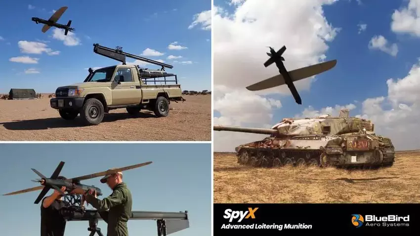 BlueBird hat die Kamikaze-Drohne SpyX mit einem 2,5 kg schweren Sprengkopf, einer Geschwindigkeit von bis zu 150 km/h und einer Startreichweite von bis zu 50 km vorgestellt