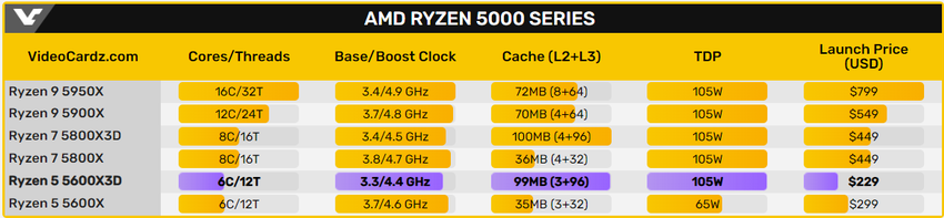 Der neue Prozessor ist mit 99 MB Cache-Speicher ausgestattet (3 MB L2 + 96 MB L3). Der zuvor erwähnte Ryzen 5600X hat fast dreimal weniger Speicher (3 MB + 32 MB). Die Anforderungen an die Wärmeableitung wurden von 65W auf 105W erhöht.