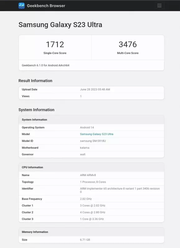 Letzte Woche hat das Samsung Galaxy S23 Ultra mit dem Betriebssystem Android 14 den Leistungstest in Geekbench 6.1 bestanden. Das Smartphone hat die Modellnummer SM-S981U (AT&T) und verfügt über 8 GB RAM.