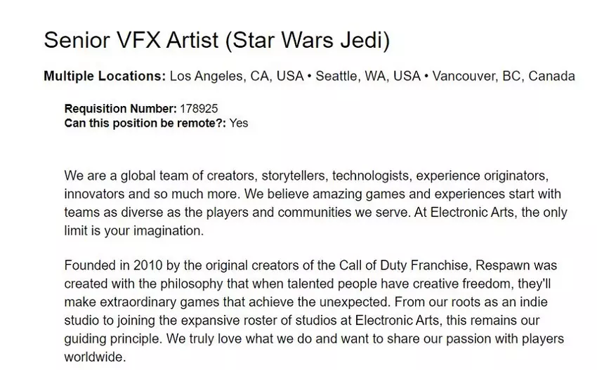 Die erste Bestätigung ist aufgetaucht, dass Respawn Entertainment an einem weiteren Spiel der Star Wars Jedi-Serie arbeitet. Das Unternehmen hat eine Stellenausschreibung veröffentlicht, aus der hervorgeht, dass das Team einen Senior Special Effects Artist, einen Senior Battle System Designer und einen Lead Writer sucht, was darauf hindeutet, dass sie alle an einem Spiel arbeiten werden, das auf dem Star Wars-Universum und der Unreal Engine 5 basiert.