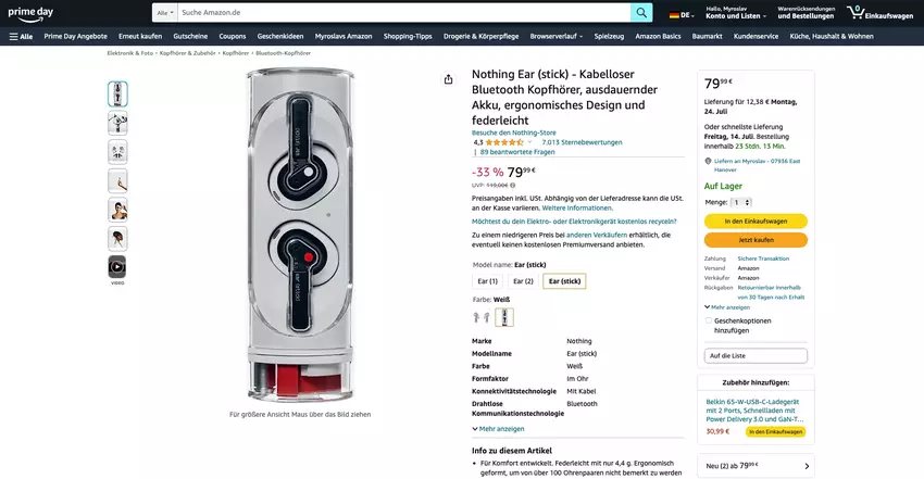Amazon Prime Day 2023: TWS Kopfhörer Nothing Ear (Stick) um 33% reduziert