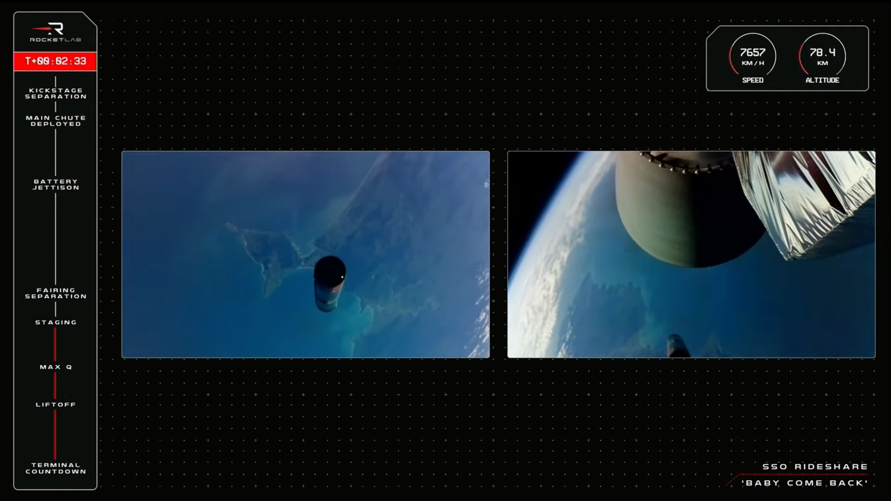 Die erste Stufe der Electron-Rakete stürzte in die Gewässer des Pazifiks. Rocket Lab beabsichtigt, sie im Rahmen eines Plans zur Entwicklung eines neuen Konzepts mit wiederverwendbaren ersten Stufen zu untersuchen.