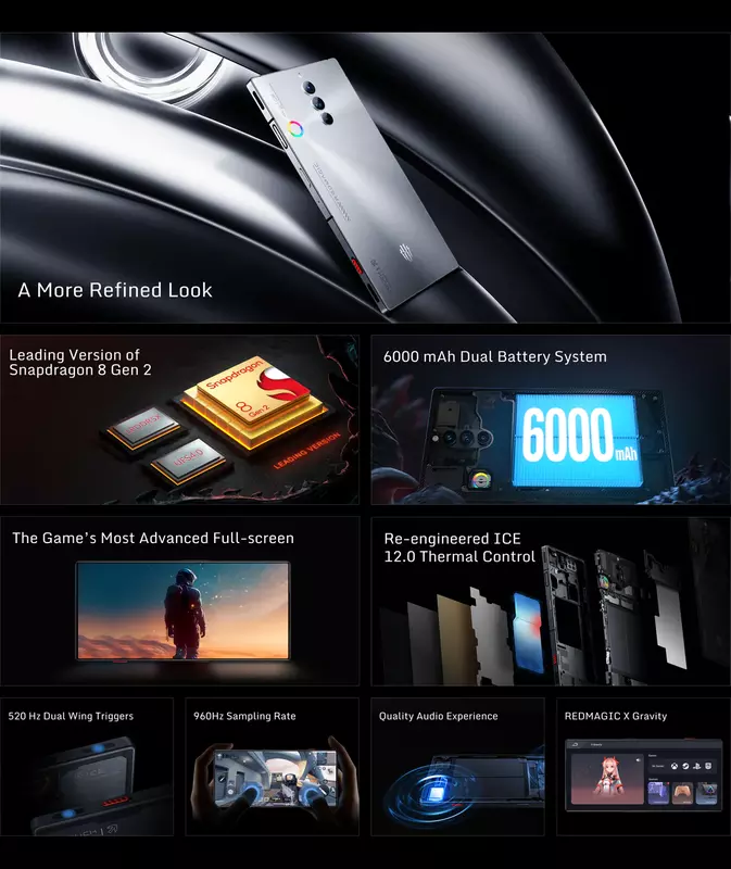 Das nubia Red Magic 8S Pro ist mit einem Snapdragon 8 Gen LV Chip mit übertakteter CPU und GPU ausgestattet. Die maximale Taktrate des Prozessors beträgt 3,36 GHz statt der üblichen 3,2 GHz. Das Smartphone verfügt über einen 6000-mA*h-Akku mit 65-W-Schnellladefunktion, das sind 20 Watt weniger als bei der Version für den chinesischen Markt.