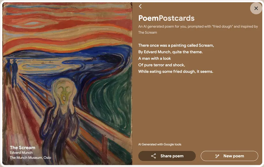 Google hat ein neues Tool auf den Markt gebracht, mit dem man durch künstliche Intelligenz generierte Gedichtpostkarten auf der Grundlage eines Kunstwerks und eines ausgewählten Themas erstellen kann.