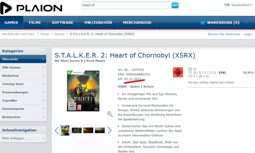 Die Veröffentlichung von S.T.A.L.K.E.R. 2: Heart of Chornobyl könnte am 1. Dezember erfolgen: Einer der Online-Shops auf der Seite des Shooters hat dieses Datum vermerkt
