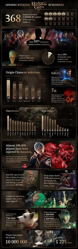 1.225 Jahre im Spiel und die Perfidie von Astarion - die Entwickler von Baldur's Gate III haben einige interessante Statistiken für die ersten drei Tage nach der Veröffentlichung veröffentlicht