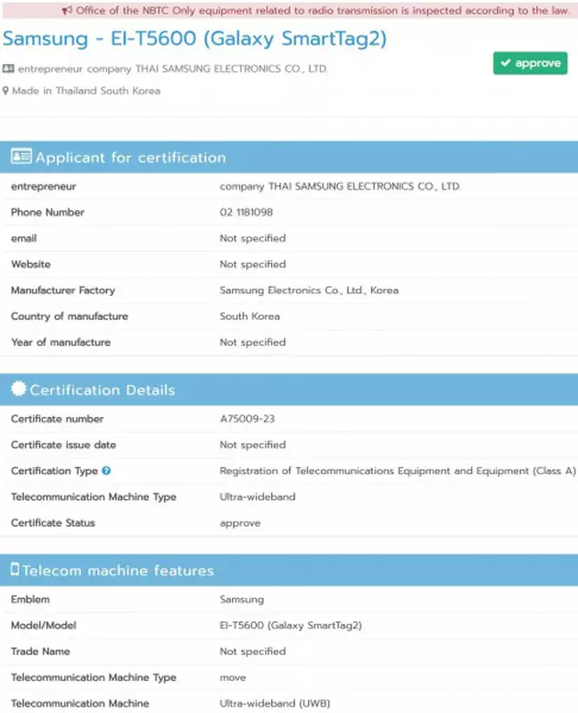 Das Gerät wurde in der Datenbank der Zertifizierungsagentur NBTC gesichtet. Das Gerät wird mit der Modellnummer EI-T5600 geführt.