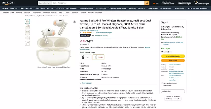 Vor zwei Monaten hat realme die realme Buds Air 5 Pro TWS Kopfhörer in Europa eingeführt. Jetzt können Sie ihn bereits mit einem Rabatt auf Amazon kaufen.