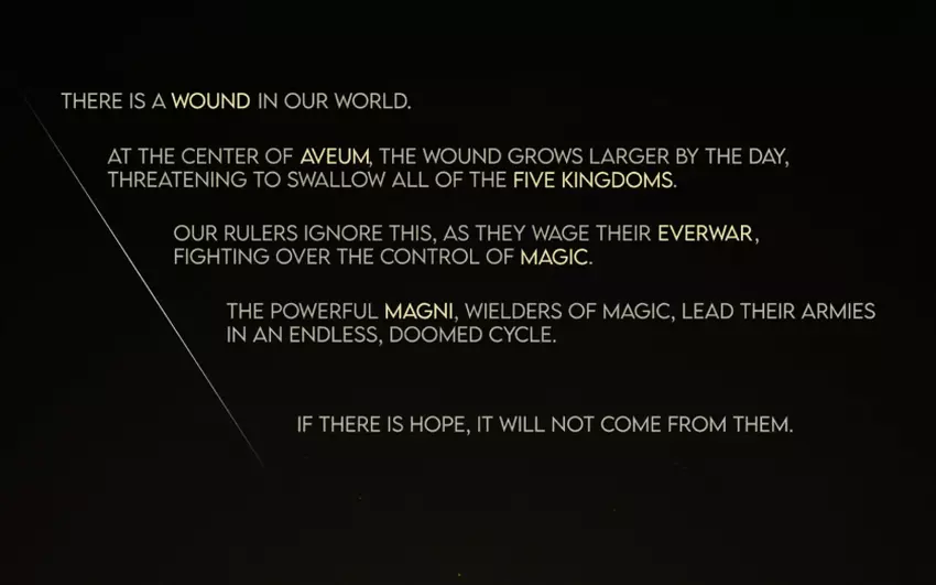 Das Spiel beginnt mit einer kurzen Erklärung, was hier passiert. Im Zentrum von Aveum befindet sich eine mysteriöse Wunde, die jeden Tag größer wird und droht, die Königreiche zu verschlingen. Doch die Herrscher ignorieren sie. Sie kämpfen nur um die Kontrolle der Magie im ewigen Krieg, und es gibt keine Hoffnung für sie.
