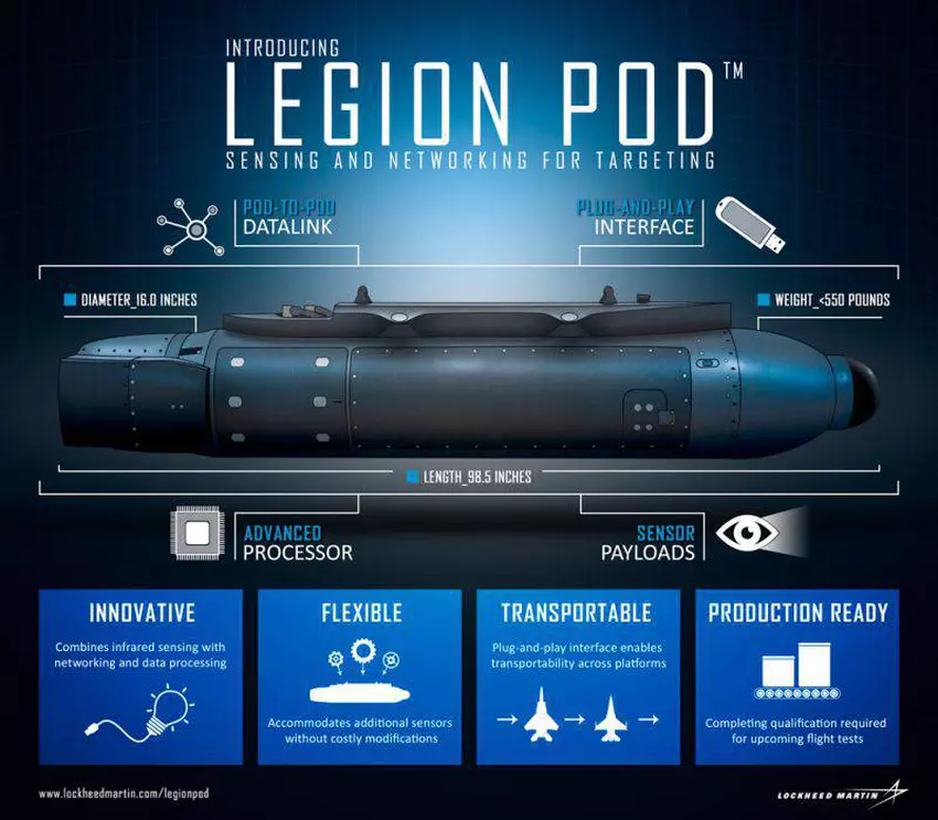 Der Legion Pod wurde Anfang 2015 vorgestellt. Nach Angaben von Lockheed Martin kann das neue IRST-System mehrere Objekte gleichzeitig verfolgen und eine effektive Zielerfassung ermöglichen, selbst wenn fortschrittliche Störungsfunktionen eingesetzt werden.