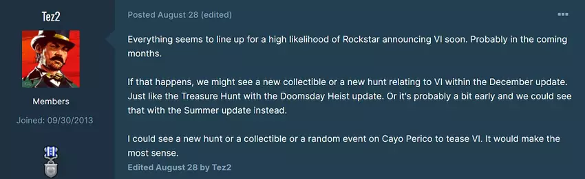 Der maßgebliche Insider Tez2, der sich auf Nachrichten über Rockstar-Projekte spezialisiert hat, berichtet auf GTAForums, dass die offizielle Ankündigung von Grand Theft Auto VI in den nächsten Monaten erfolgen könnte und von einem thematischen Event in GTA V begleitet wird, das mit dem Dezember-Update beginnt