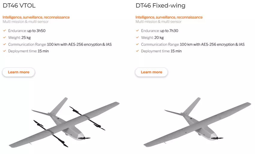 Die dritte Drohne ist die Delair DR46. Sie ist als Starrflügler und Senkrechtstarter/Landung erhältlich. Die erste Version kann bis zu 7,5 Stunden fliegen und bis zu 5 kg Nutzlast tragen. Die VTOL-Variante hat eine Flugzeit von fast 4 Stunden.