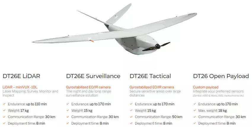 Die zweite Drohne ist die Delair DT26 (siehe Bild oben). Diese Drohne ist in vier Varianten erhältlich: LiDAR, Überwachung, taktisch und offene Nutzlast. Die Spezifikationen variieren je nach Modell. Sie hat eine maximale Flugzeit von 170 Minuten, ein Abfluggewicht von 18 kg und eine Reichweite von 50 km.