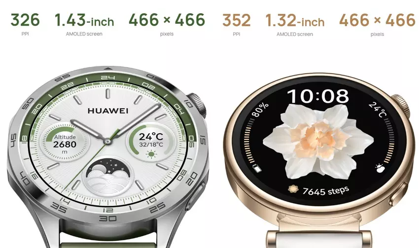 Die Huawei Watch GT4 ist in zwei Varianten erhältlich. Die erste hat eine Größe von 41 mm. Die Uhr ist mit einem AMOLED-Display mit einer Auflösung von 466 x 466 Pixeln und einem Durchmesser von 1,32" ausgestattet. Bei aktivem Always-on-Display-Modus kann sie zwei Tage lang laufen. Die maximale Betriebszeit ohne Aufladen beträgt 7 Tage.