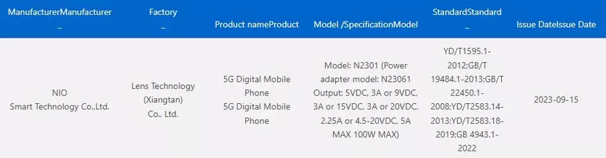 Diesmal wurde das Nio Phone in der Datenbank der Zertifizierungsagentur 3C gesichtet. Die Neuheit läuft unter der Modellnummer N2301. Dem Bericht zufolge wird das Gerät die Schnellladetechnik mit einer Leistung von 100 W unterstützen. Leider, Informationen über die Batterie der Neuheit Leck nicht offenbaren.