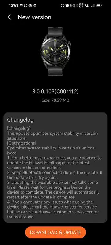 Das Update wurde auf dem globalen Markt veröffentlicht. Das System begann bisher, Besitzer der 46mm-Version der Uhr zu erhalten. Die Firmware hat die Build-Nummer HarmonyOS 3.0.0.0.103 und wiegt 78 MB. Wenn Sie das Update noch nicht erhalten haben, können Sie selbst in der Huawei Health-App nach dem OTA suchen.