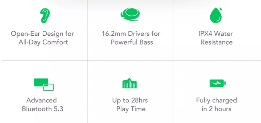 Das Modell ist für sportliche Aktivitäten geeignet. Es hat einen IPX4 Spritzwasserschutz, d.h. es hat keine Angst vor Regentropfen und Schweiß. Dank der Over-Ear-Befestigung fällt der Kopfhörer beim Laufen nicht herunter. Die Verbindung zu Smartphones erfolgt über das Bluetooth 5.3-Protokoll.