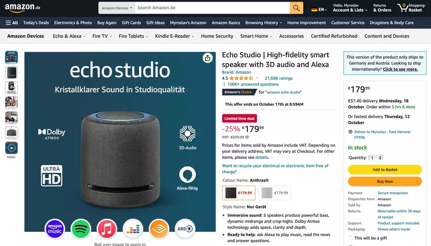 Amazon hat mit dem Verkauf des intelligenten Lautsprechers Echo Studio mit einem Preisnachlass begonnen.