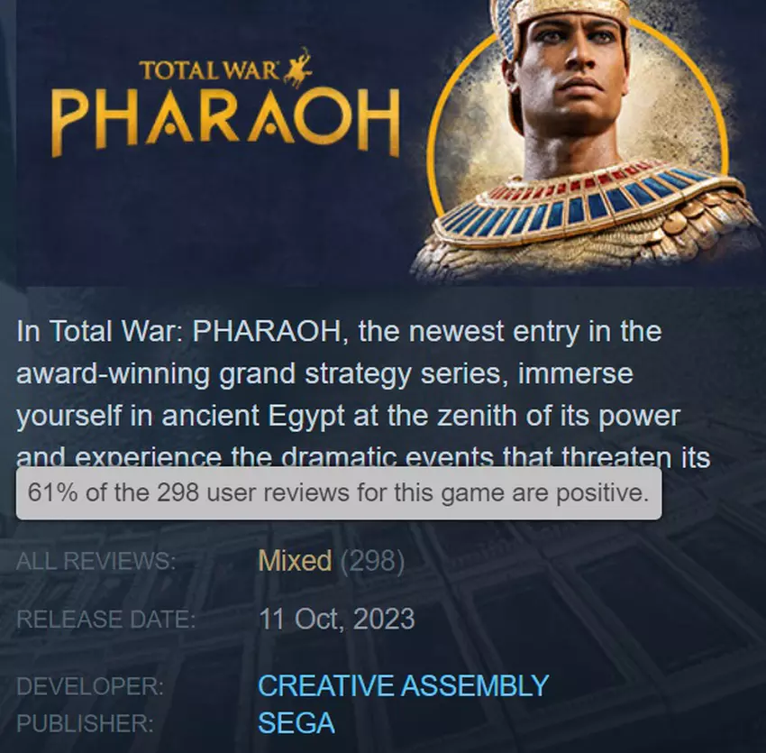 Einen Tag nach der Veröffentlichung des Strategiespiels erhielt es auf Steam nur 61 % positives Feedback bei 300 Bewertungen. Die Spieler vergleichen Pharaoh mit einem der umstrittensten Spiele der Serie Total War Saga: Troy, was nicht für die Neuheit spricht.