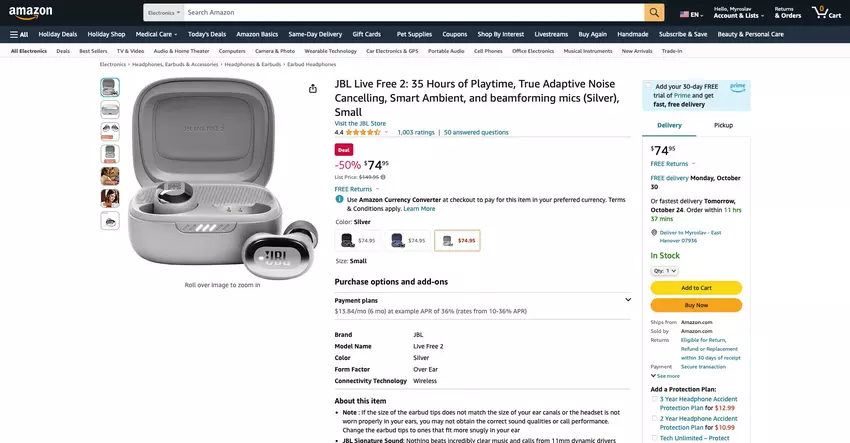 Es handelt sich um den JBL Live Free 2 für $164.95 Rabatt. Es sind drei Farben erhältlich: Schwarz, Blau und Silber.