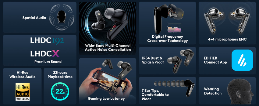 Die Edifier NeoBuds Pro 2 haben eine Vakuumkonstruktion und verfügen über Spatial Audio sowie ein Breitband-Mehrkanal-Geräuschunterdrückungssystem. Die Technologie dämpft Störgeräusche um bis zu 50 dB. Das System ist in der Lage, die Umgebung zu analysieren und die ANC automatisch anzupassen.