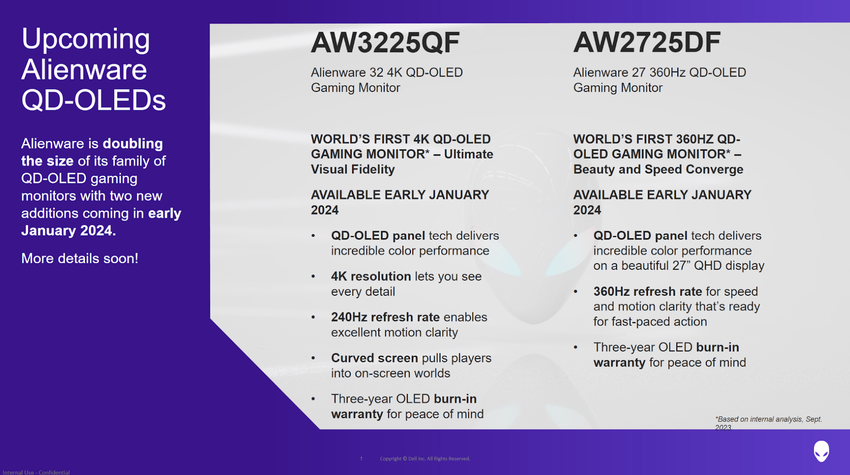 Alienware zeigte die Gaming-Monitore AW3225QF und AW2725DF. Beide basieren auf QD-OLED-Panels. Nach Angaben des Herstellers ist der AW3225QF der weltweit erste Monitor mit einem 4K ULTRA HD QD-OLED-Display. Er hat eine Bildwiederholfrequenz von 240 Hz, einen gebogenen Bildschirm und unterstützt die AMD Freesync Premium Technologie.