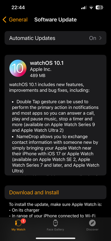 Die Firmware wurde unter dem Namen watchOS 10.1 veröffentlicht und wiegt über 400 MB. Das Update enthält eine Reihe von Fehlerkorrekturen, verbesserte Sicherheit und ein paar neue Funktionen: NameDrop und Double Tap. Ersteres ermöglicht den schnellen Austausch von Kontakten zwischen der Smartwatch und dem iPhone. Dazu müssen Sie die Geräte zueinander bringen.