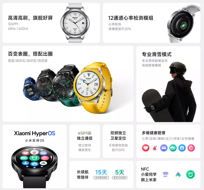 Die maximale Betriebszeit ohne Aufladen beträgt 15 Tage. Wenn der Modus "Always-on-Display" aktiviert ist, muss die Uhr mindestens alle fünf Tage aufgeladen werden. Ebenfalls erwähnenswert sind die NFC-Funktion, der 10ATM-Wasserschutz und die Sturzerkennung. Als Software-Plattform kommt das neue HyperOS-Betriebssystem zum Einsatz.