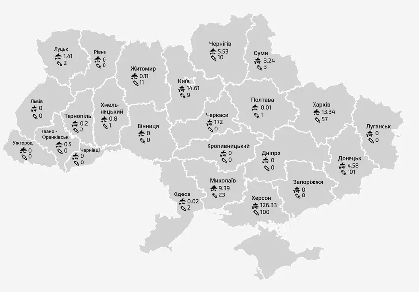 Nach Angaben des Staatlichen Notstandsdienstes der Ukraine (SESU) haben seine Mitarbeiter bereits 447.841 explosive Gefahrenquellen neutralisiert und mehr als 100.000 Hektar auf dem Territorium der Ukraine untersucht. Im Durchschnitt vermint der Staatliche Notstandsdienst 350 Hektar pro Tag und neutralisiert 320 explosive Kampfmittel bei 140 Besuchen. Die meisten explosiven Kampfmittelreste wurden in den Regionen Charkiw (81.490), Kiew (80.045), Tschernihiw (52.289) und Donezk (47.225) neutralisiert. Nach Angaben des UN-Büros für die Koordinierung humanitärer Angelegenheiten(OCHA) ist die Ukraine eines der am stärksten mit Minen verseuchten Länder der Welt.