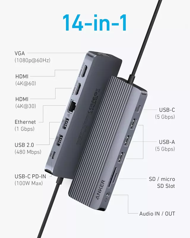 Anker hat in Europa einen USB-C-Hub (14-in-1) mit Unterstützung für bis zu 3 Monitore und einem Preis von 79 € eingeführt