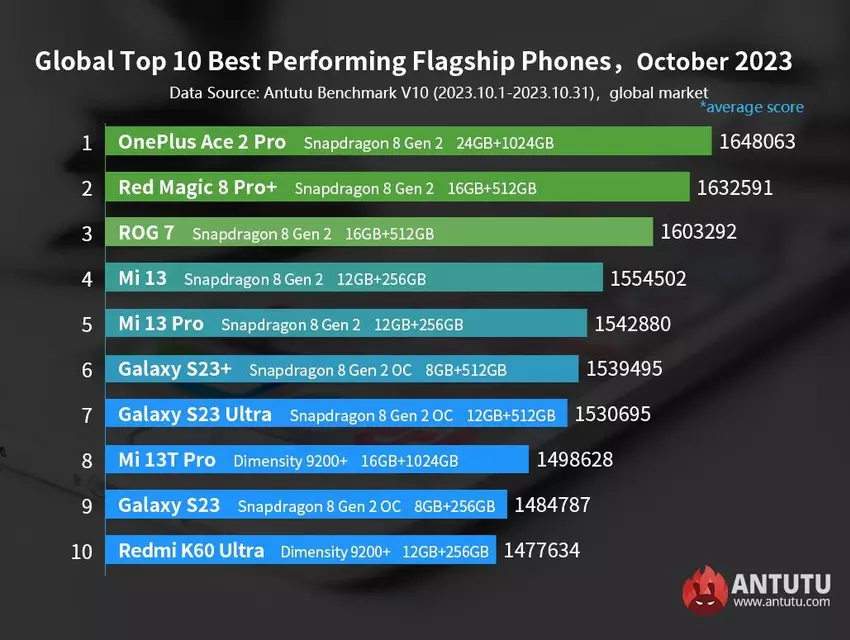 Smartphones, die auf dem mobilen Prozessor Snapdragon 8 Gen 2 basieren, dominieren die Rangliste. Sie belegten 80 % der Liste. Spitzenreiter war das OnePlus Ace 2 Pro mit einem Rekord von 24 GB RAM. Sein Ergebnis lag bei 1.648.063 Punkten.