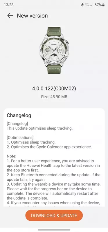 Es handelt sich um ein System, das auf HarmonyOS 4 basiert. Die Firmware ist Version 4.0.0.122 (C00M02) und wiegt 45 MB. Das System wurde bereits in Wellen an Uhren auf der ganzen Welt verteilt. Sie können die OTA-Verfügbarkeit in der Huawei Health-App überprüfen.