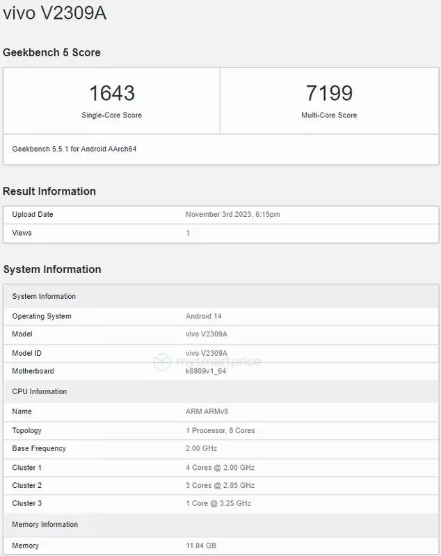 Wir sprechen über das Modell vivo X100. Das Gadget läuft mit der Modellnummer V2309A. Das Leck bestätigt, dass das Smartphone mit dem neuen MediaTek Dimensity 9300 Top-End-Prozessor ausgestattet ist. Der Chip hat einen einzelnen Cortex-X4-Kern, der mit 3,25 GHz getaktet ist, drei Cortex-X4-Kerne, die mit 2,85 GHz getaktet sind, und vier Cortex-A720-Kerne, die mit 2,0 GHz getaktet sind und auf der Armv9-Architektur basieren. Das Gerät wird außerdem mit 12 GB RAM und dem Betriebssystem Android 14 ausgeliefert.