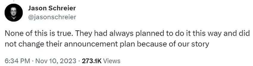 Leider gab es für die Entwickler keine Überraschung, denn ein paar Stunden zuvor informierte der maßgebliche Insider und Bloomberg-Journalist Jason Schreier die Öffentlichkeit über die bevorstehende Ankündigung.