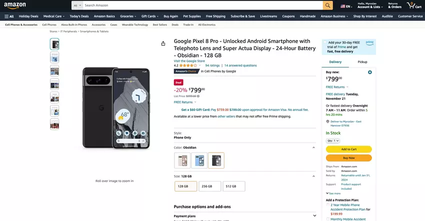 - Google Pixel 8 Pro, 128 GB - $999.00.