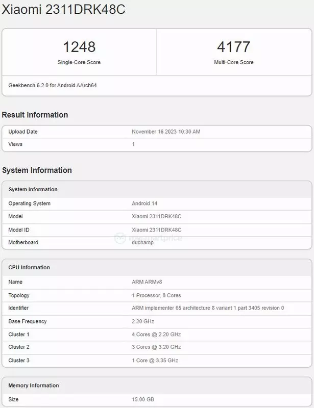 Die Neuheit in dem Bericht läuft unter der Modellnummer 2311DRK48C. Der Leak bestätigt, dass das Gerät von einem neuen MediaTek Dimensity 8300 Prozessor angetrieben wird. Der SoC wird in der nächsten Woche auf den Markt kommen. Das Smartphone wird außerdem mit 16 GB RAM und Android 14 als Betriebssystem ausgestattet sein.