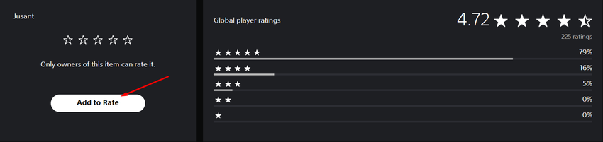 Wenn du eine Spieleseite in der Web-Version des PS Store öffnest, siehst du die Gesamtbewertung und die Anzahl der Spieler, die das Spiel bereits bewertet haben, und du kannst auch deine eigene Bewertung abgeben. Dazu musst du auf der Seite ein wenig nach unten scrollen, wo du den Abschnitt "Bewertung" findest. Dann klickst du auf "Zur Bewertung hinzufügen" und gibst ihr 1 bis 5 Sterne.