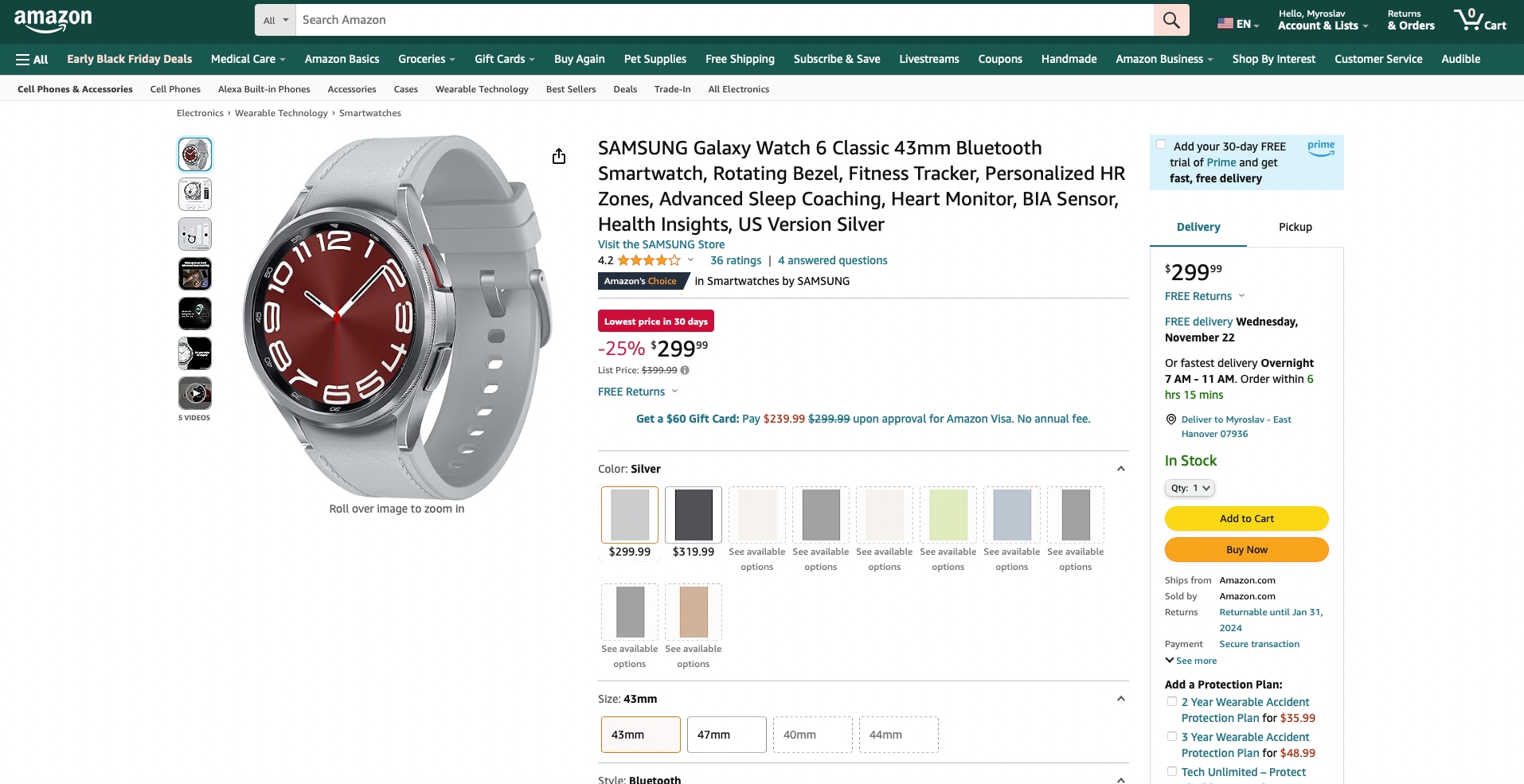 Es handelt sich um das Modell Samsung Galaxy Watch 6 Classic in der Farbe Silber, mit Bluetooth und einem 43 mm Gehäuse. Das Gerät kostet $200.99 $399.99, -50%. Dies ist der beste Preis für dieses Gerät in den letzten 30 Tagen.