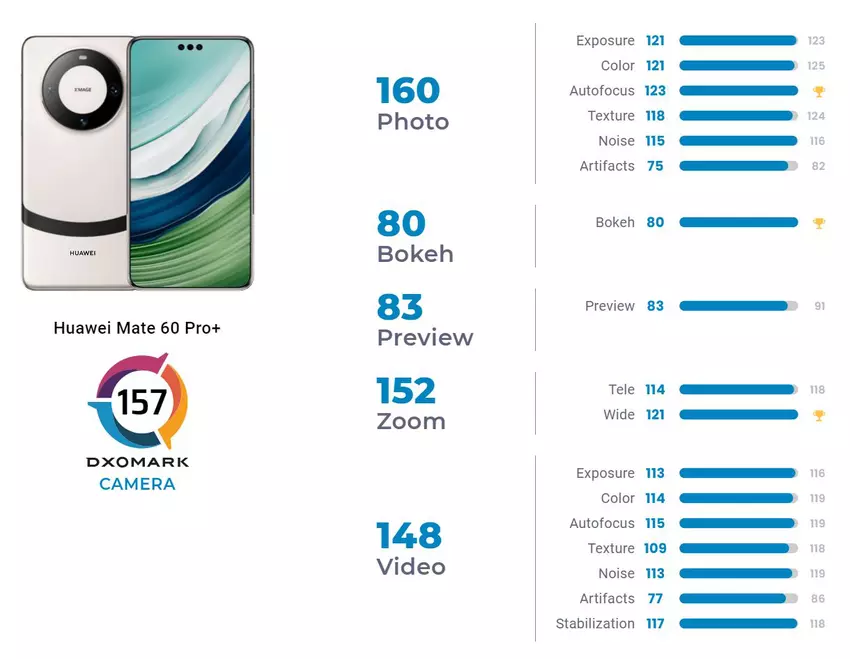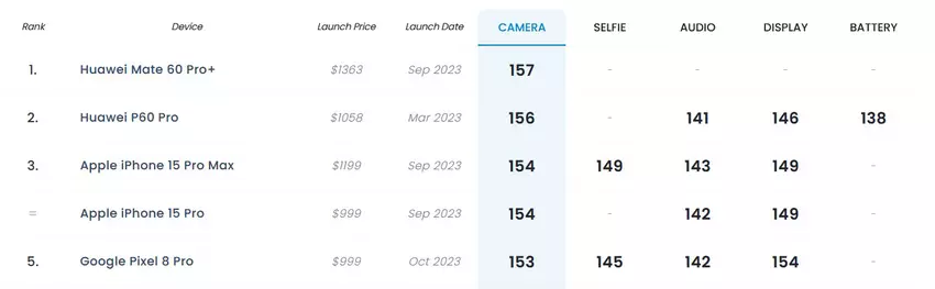 In der Gesamtwertung schlug das Huawei Mate 60 Pro+ das Mate 60 Pro um einen Punkt und wurde zum neuen Spitzenreiter, der dem jüngeren Modell den Titel des besten Kamerahandys abnahm. Auf den Plätzen 3 und 4 folgen das iPhone 14 Pro und das iPhone 14 Pro Max (jeweils 154 Punkte) und auf den Plätzen 5 und 6 das Google Pixel 8 Pro und das Oppo Find X6 Pro, die jeweils 153 Punkte erreichen.