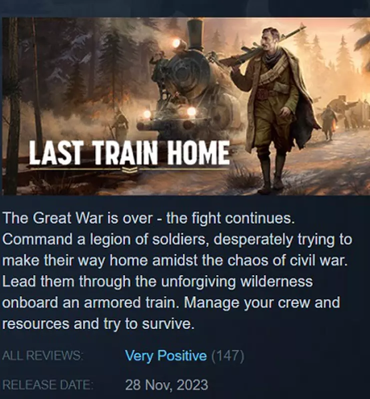 Bis zum 5. Dezember wird Last Train Home auf Steam mit 15% Rabatt verkauft. Wer das Spiel vor diesem Datum kauft, erhält kostenlosen Zugang zum ersten Legion Tales Add-on.