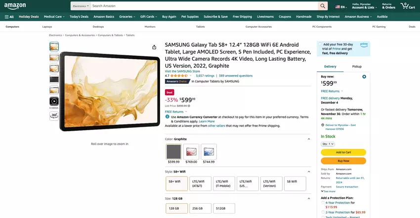 Die Rede ist vom Modell Galaxy Tab S8+. Das Gerät kann jetzt in einer Wi-Fi-Version, in der Farbe Graphit und mit 128 GB Speicherplatz für check price on amazon gekauft werden.