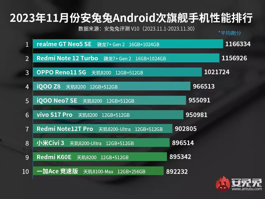 Das Schicksal des ersten Platzes wurde durch weniger als 10.000 Punkte entschieden. Der Spitzenreiter war das realme GT Neo 5 SE, und der zweite Platz ging an das Redmi Note 12 Tubo. Ihre Punktzahlen betrugen 1.166.334 bzw. 1.156.926 Punkte. Beide Modelle werden von einem Qualcomm Snapdragon 7+ Gen 2 Chip angetrieben und liegen seit mehr als einem halben Jahr an der Spitze.