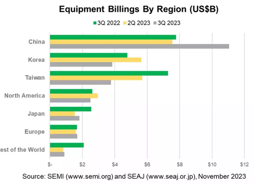 Unternehmen aus dem Reich der Mitte erhöhten ihre Ausgaben für Ausrüstungskäufe um 42 % im Vergleich zum dritten Quartal 2022 und um 46 % im Vergleich zum zweiten Quartal 2023. Dabei ist zu beachten, dass chinesische Hersteller aufgrund von Sanktionen möglicherweise nicht die modernste Ausrüstung kaufen.