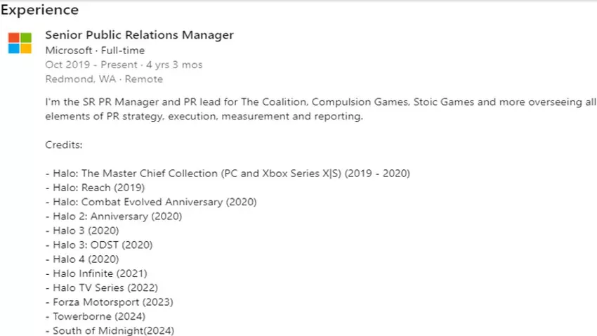 Brad Hilderbrand, Senior Manager of Public Relations bei Microsoft, hat auf seiner LinkedIn-Seite alle Projekte des Unternehmens aufgelistet, an denen er beteiligt ist, und South of Midnight ist eines davon. Außerdem ist das Jahr der Veröffentlichung des Spiels - 2024 - auf der Seite angegeben.