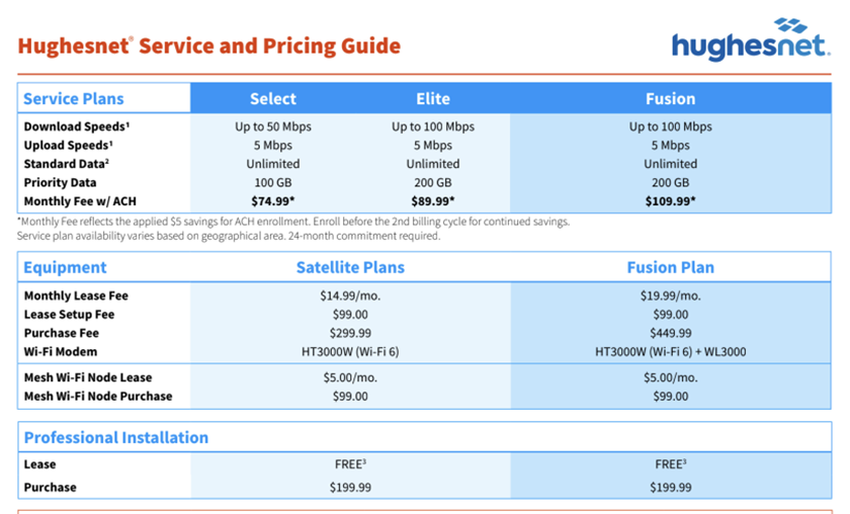 HughesNet-Kunden können die Geräte kaufen oder leasen. Die Kosten unterscheiden sich je nach Plan. Für Select und Elite kostet der Kauf 300 Dollar, während Fusion 450 Dollar kostet. Die Mietpreise liegen bei 15 $ bzw. 20 $ pro Monat. Wenn Sie die Geräte kaufen, müssen Sie zusätzlich 200 Dollar für die Installation bezahlen.