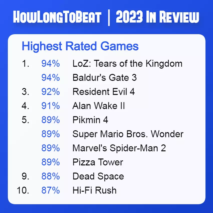 Diesmal wird eine Auswahl der laut HowLongToBeat-Nutzern am höchsten bewerteten Spiele präsentiert, die im Jahr 2023 erschienen sind.