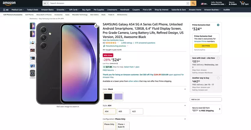 Es handelt sich um das Samsung Galaxy A54 5G Smartphone. Das Gerät kostet derzeit check price on amazon. Wenn Sie jedoch ein Prime-Abonnement haben, können Sie den Preis des Geräts um 125 $ reduzieren. Genau das gleiche Angebot gab es übrigens auch während des Black Friday Sale im November.