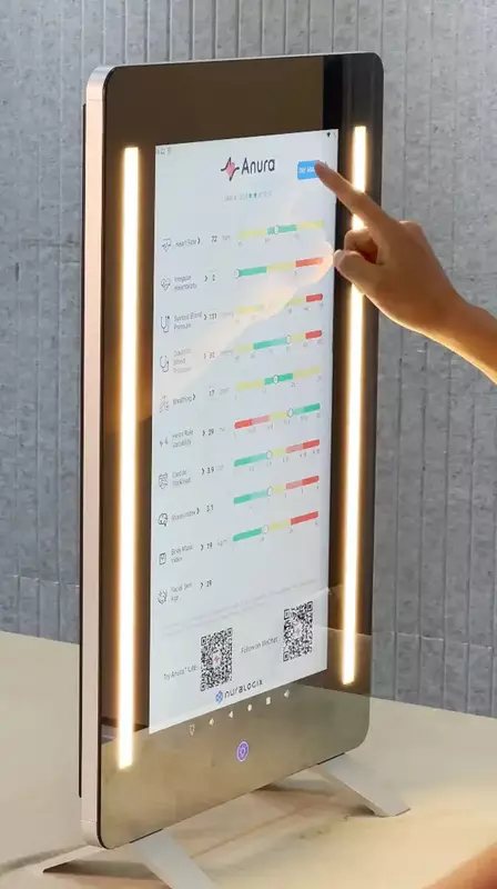 Der Spiegel ist mit einem 21,5-Zoll-Bildschirm und zahlreichen Sensoren ausgestattet, die das Muster der Blutgefäße und Venen im Gesicht einer Person analysieren. Alles, was Sie tun müssen, ist, sich vor den Bildschirm zu setzen, den Anweisungen zu folgen und 30 Sekunden lang still zu sitzen. Das System scannt Ihr Gesicht und sendet die Daten an die Cloud, wo sie ausgewertet werden. Algorithmen des maschinellen Lernens analysieren die Daten, um mehr als 100 Gesundheitsparameter zu bestimmen.