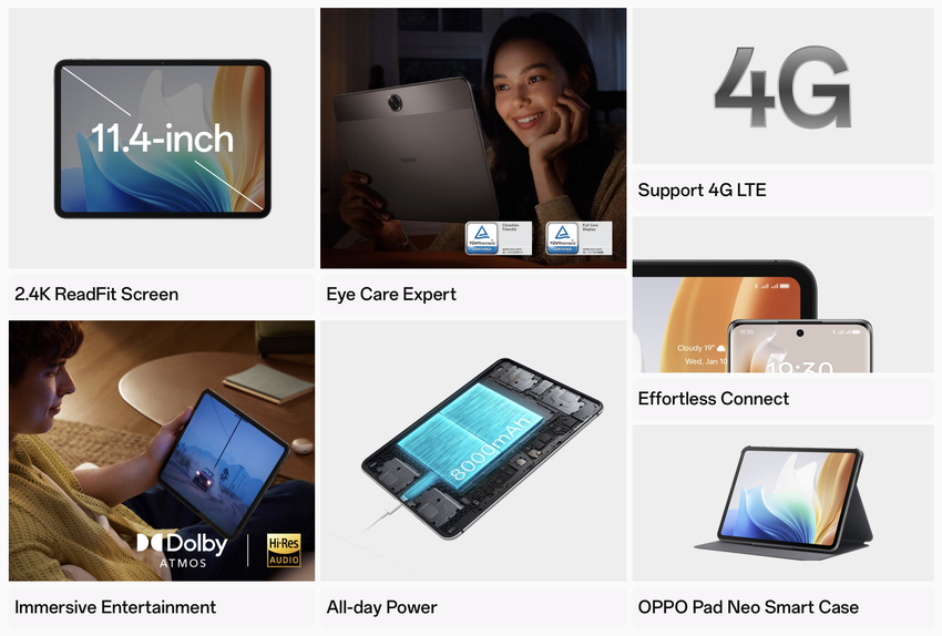 Das OPPO Pad Neo kommt mit einem 11,35 Zoll großen LCD-Display. Der Bildschirm hat eine FHD+ Auflösung und eine 90Hz Bildwiederholrate. Das neue Produkt verfügt über Stereolautsprecher mit Dolby Atmos-Unterstützung, Wi-Fi 5, Bluetooth 5.2, GPS, USB-C-Anschluss, SIM-Slot und einen 8000-mAh-Akku mit 33-W-SuperVOOC-Ladung. Das Tablet verfügt über zwei Kameras: eine 8-MP-Hauptkamera und die gleiche Frontkamera. Das Gerät wird mit dem Betriebssystem Android 13 und der ColorOS 13.2-Oberfläche ausgeliefert.